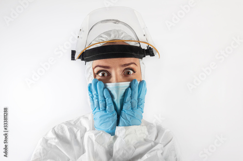 Isolated virus scare caucasian woman in medical uniform and face mask. Concept of covid-19 and Asian flu panic.