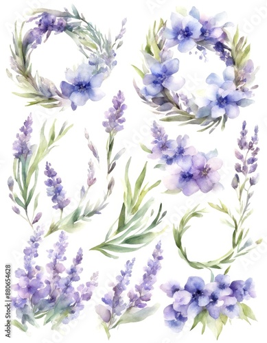 isolated watercolor wreaths bluebells set flower background white ideal lavender composition beautiful botanic drawn creating chaplet olated frame provence cards illustration flowers invitations
