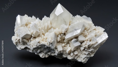 Isolated white crystal mineral quartz object crushed on a rough black abstract background