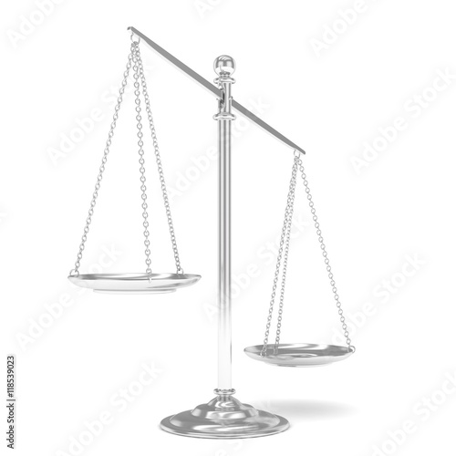 Isolated white silver scales on white background. Symbol of judgement. Law, measurement, liberty in one concept. 3D rendering.