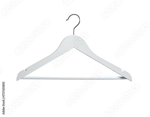 Isolated white wooden clothing hanger with chrome hook. Clean background