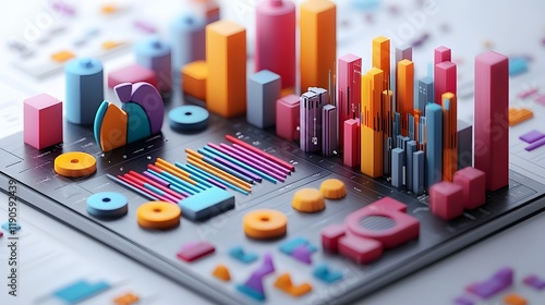 Isometric 3D render of colorful business analytics with graphs and pie charts in a modern design