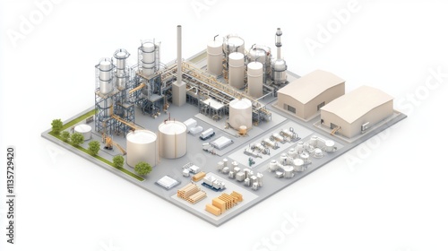 Isometric 3D View of Petroleum Plant with Equipment and Storage Facilities