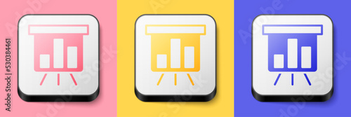 Isometric Board with graph chart icon isolated on pink, yellow and blue background. Report text file icon. Accounting sign. Audit, analysis, planning. Square button. Vector