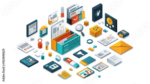 Isometric Business Analytics Tools Illustration, Isometric illustration of business analytics tools, charts, and documents