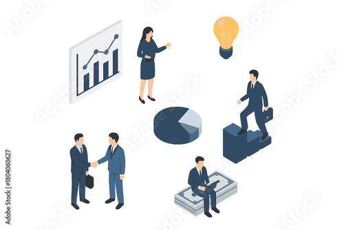 Isometric business concepts featuring finance charts and professional people