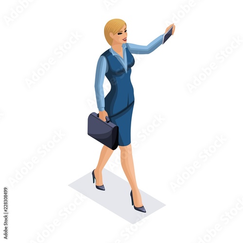 Isometric business woman with gadgets, young entrepreneur, taking pictures of herself, smartphone, makes video, vector illustration