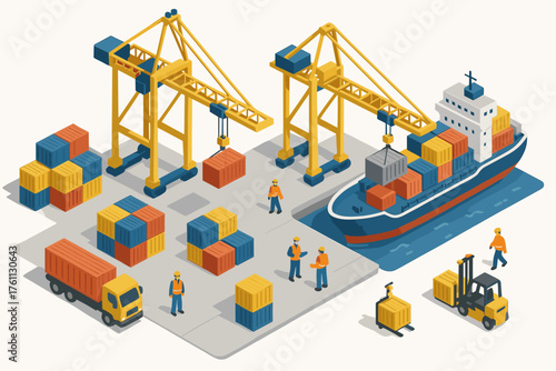 Isometric cargo port with workers, crane, ship, and containers
