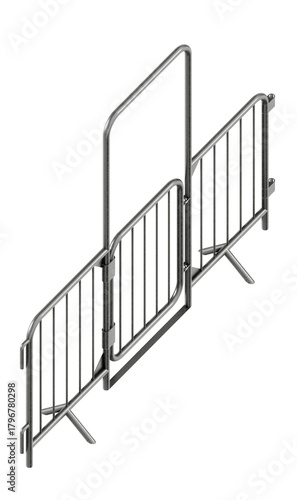 isometric crowd control barrier 3d model with hinged pedestrian gate, game asset ready.