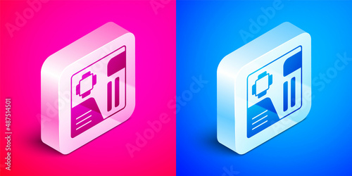 Isometric Electronic computer components motherboard digital chip integrated science icon isolated on pink and blue background. Circuit board. Silver square button. Vector