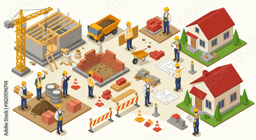 Isometric House Construction Site with Builders and Equipment – Vector Illustration