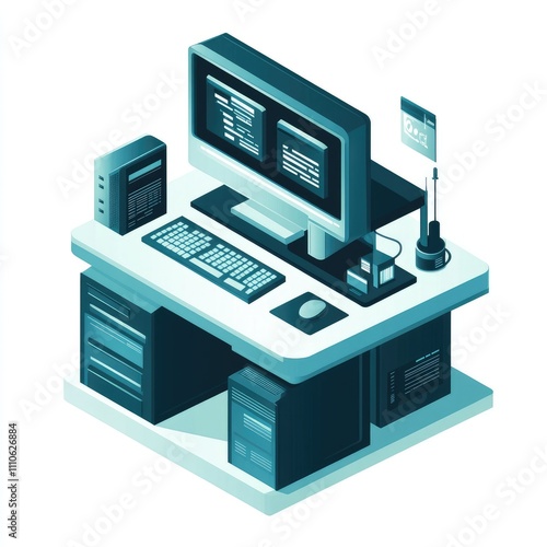 Isometric illustration of a programmer's workspace.
