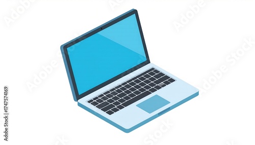 Isometric laptop illustration with a bright blue screen, open and ready for work or study, isolated on white