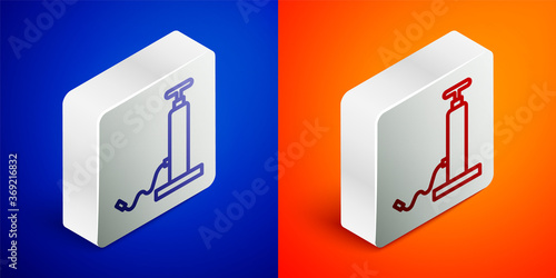 Isometric line Car air pump icon isolated on blue and orange background. Silver square button. Vector Illustration.