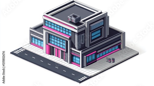 Isometric modern building exterior, urban setting, digital art, architectural design, graphic illustration, stock photo