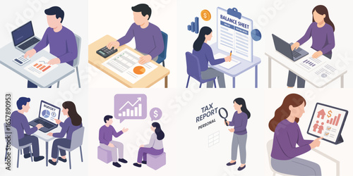 Isometric People Doing Business Financial Tasks Illustration in Workplace Concept Design