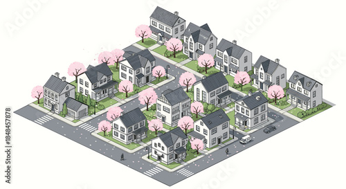 Isometric pixel art illustration of a quaint, monochrome residential neighborhood in springtime, featuring various styles of houses, streets, and blooming pink cherry blossom trees.