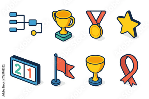 Isometric Tournament Icons. Tournaments flat icons: bracket chart, trophy, medal, star, scoreboard, flag, cup, ribbon.
