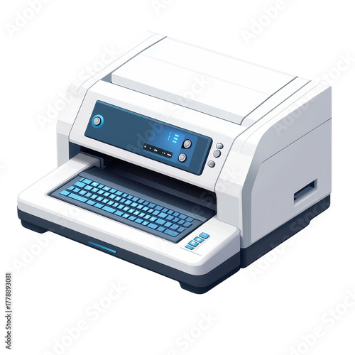 Isometric view of a modern white printer with blue accents on black on transparent background