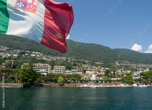 Italian flag waving on the deck of a ship sailing on Lake Maggiore