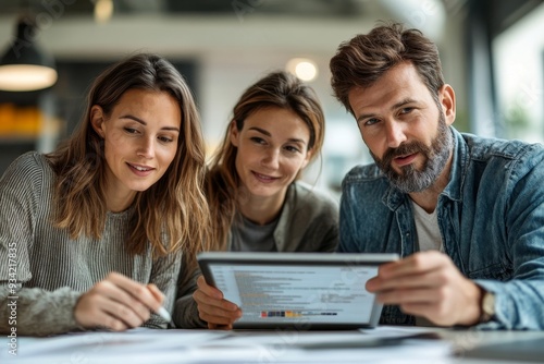 Its a meeting of the minds. Shot of three colleagues sitting around a meeting tablet in the office, Generative AI