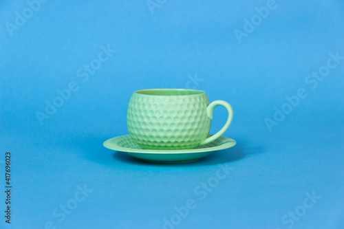 It's coffee time. green coffee cup on the table.blue background.