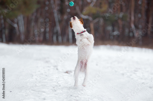 Jack Russell Terrier plays in the winter forest.