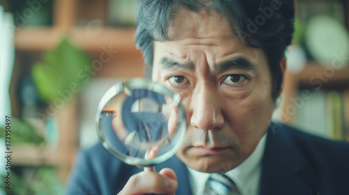 Japanese businessman holding magnifying glass to finding something, audit concept