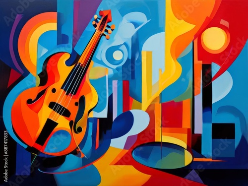 Jazz in pop art style. A bright abstract painting by a musician. Whirlwinds of color and shapes create dynamic and expressive works of art. AI Generated.