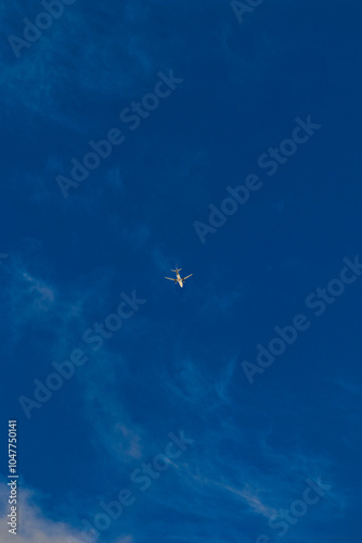 jetliner flying at high altitude over a cobalt blue sky, framed by thin cirrus clouds.