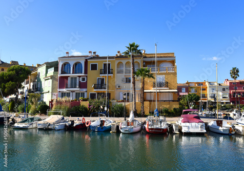 Jetty with yacht. Yachts and motor boats in marina Port Saplaya, Valencia. Yacht and fishing motorboat in yacht club. Colourful houses with apartments at coast Mediterranean Sea. Sailboat near pier.