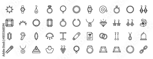 Jewelry and luxury accessories line icon set. Vector pictograms of rings, necklaces, watches, earrings, gemstones, bracelets, and diamonds, thin outline illustration.