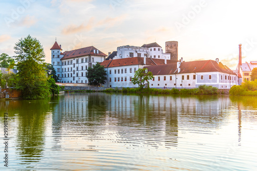 Jindrichuv Hradec Castle at sunset time. Reflected in the Little Vajgar pond, Jindrichuv Hradec, Czech Republic