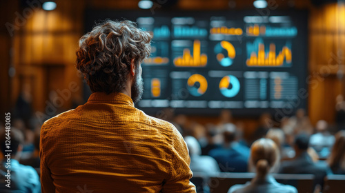Job market infographic projected on a screen, with a speaker presenting trends to a corporate audience