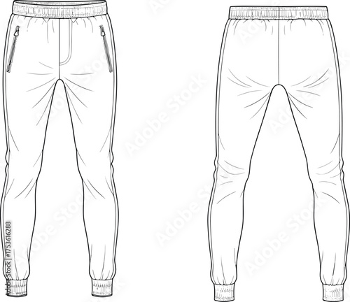 Jogger pants flat sketch, men’s fashion technical drawing, elastic waistband trousers, drawstring design, zippered pocket detail, ribbed cuff template, apparel vector illustration