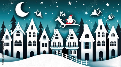 Jolly Santa on Sleigh Flying Over Snowy Village at Night with Festive Atmosphere, Illustrated Christmas Scene with Houses, Trees, and Stars