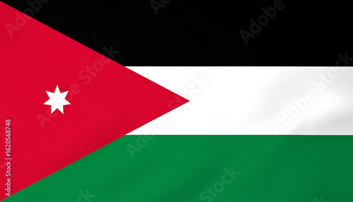 Jordanian flag with horizontal black, white, and green stripes and red triangle containing seven-pointed star, symbolizing unity, Hashemite legacy, and Arab identity.