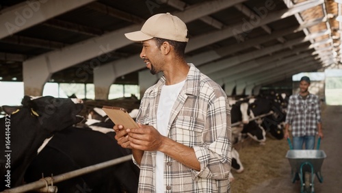 Joyful African American man farmer in cap typing on tablet standing in cowhouse. People working on background. Cattle in stall. Male using gadget in farming in barn. Cows in stable. Dairy business