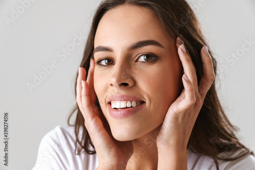 Joyful beautiful girl smiling and looking at camera