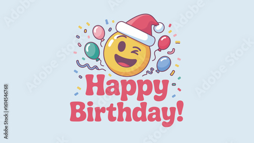 Joyful Birthday Emoji: Winking Smiley Face with Santa Hat and Balloons for a Fun Celebration