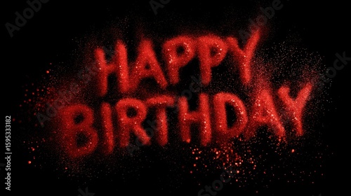 Joyful Birthday Wishes: Vibrant Red and Black Celebration Text with Sparkling Particles on a Dark Backdrop