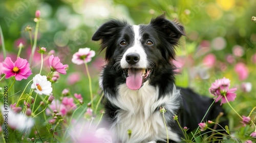 Joyful Border Collie Amidst Spring Blooms Radiating Happiness - Generative AI