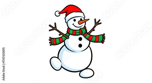 Joyful Cartoon Icon of a Snowman Dancing With a Bright Striped Winter Scarf