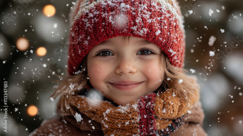 joyful child wearing red hat and scarf smiles in falling snow, capturing magic of winter. scene is filled with soft snowflakes and warm atmosphere