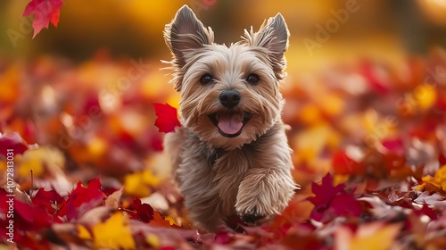 Joyful dog plays in colorful autumn leaves