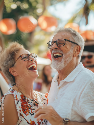 Joyful elderly couple laughing together at an outdoor summer event, capturing the warmth and happiness of shared moments in a lively atmosphere