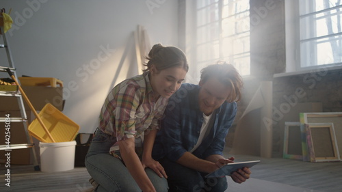 Joyful family sitting in new house. Couple searching home design on tablet.