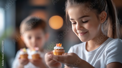 Joyful girl smiling at delicious cupcake with decorative frosting in cozy indoor setting full of warm colors