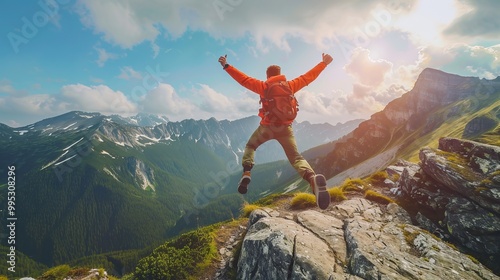Joyful hiker jumping with arms wide open on mountain summit, celebrating outdoor adventure success while wearing a backpack - Excited man embracing freedom and achievement in nature.
