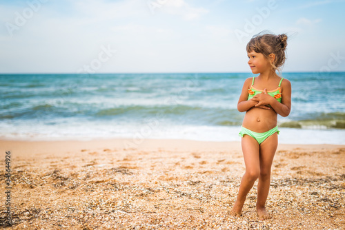 Joyful little girl enjoys a beach day while relaxing at sea on a sunny warm summer day. Summer vacation and relaxation concept